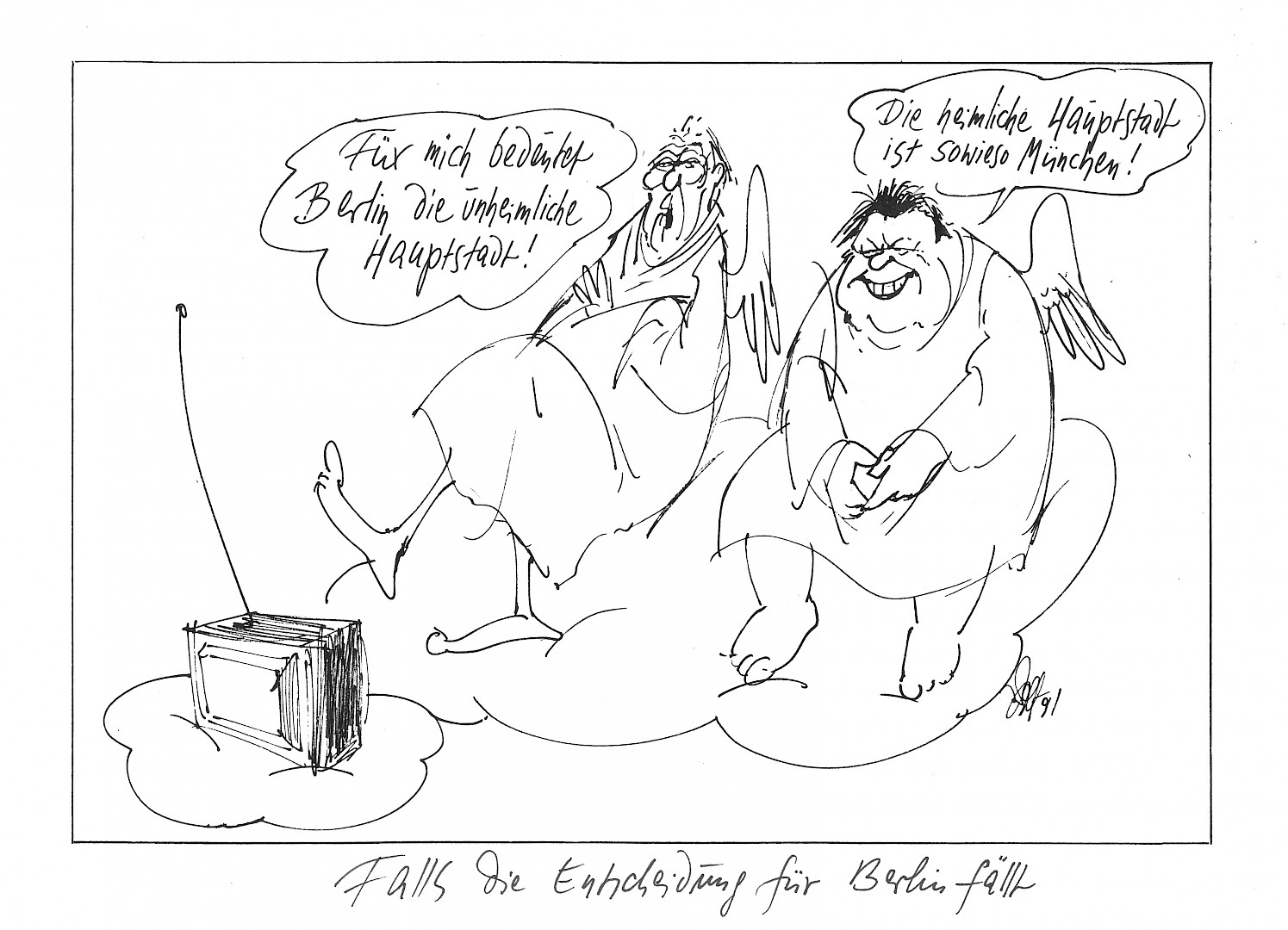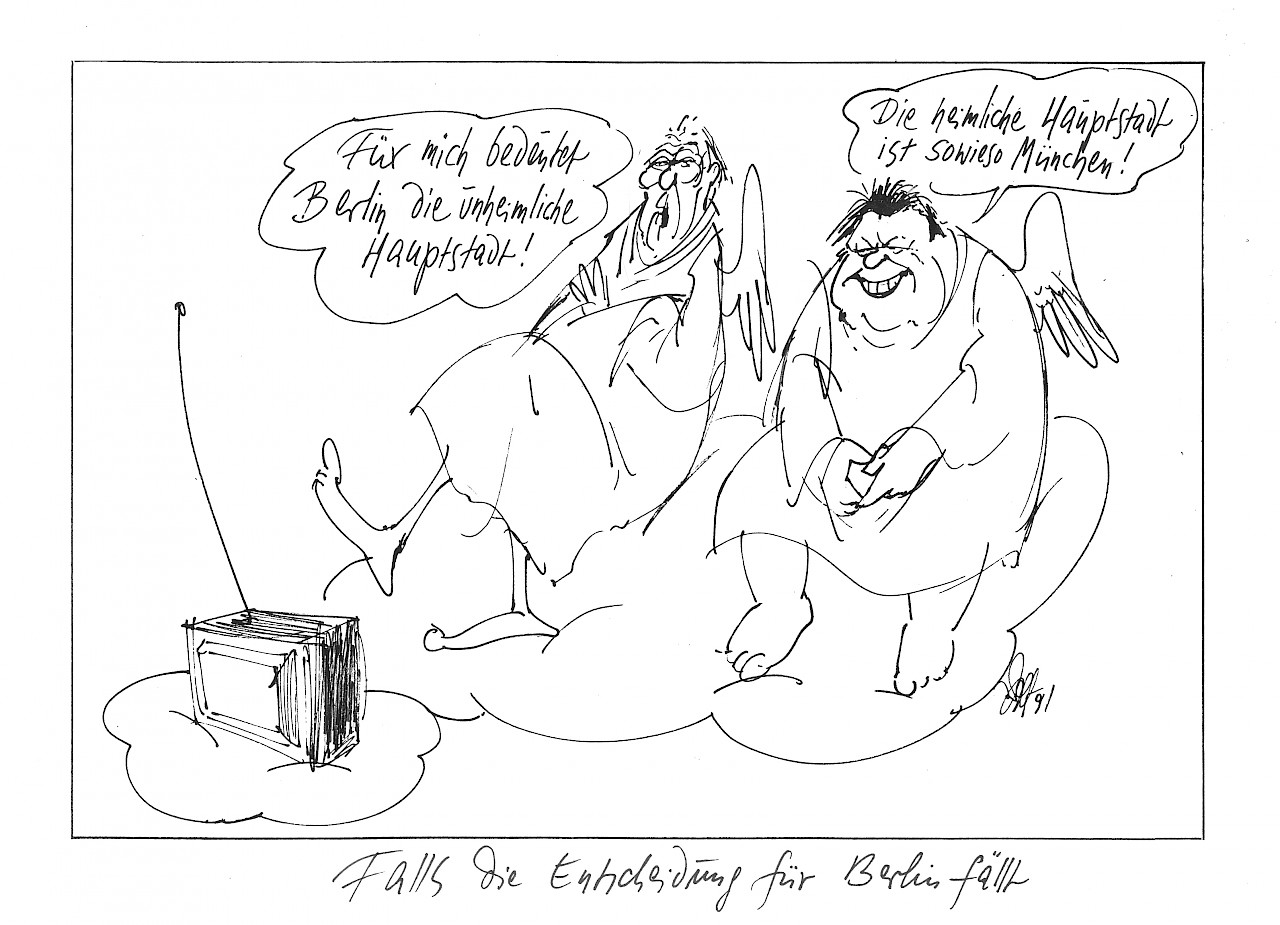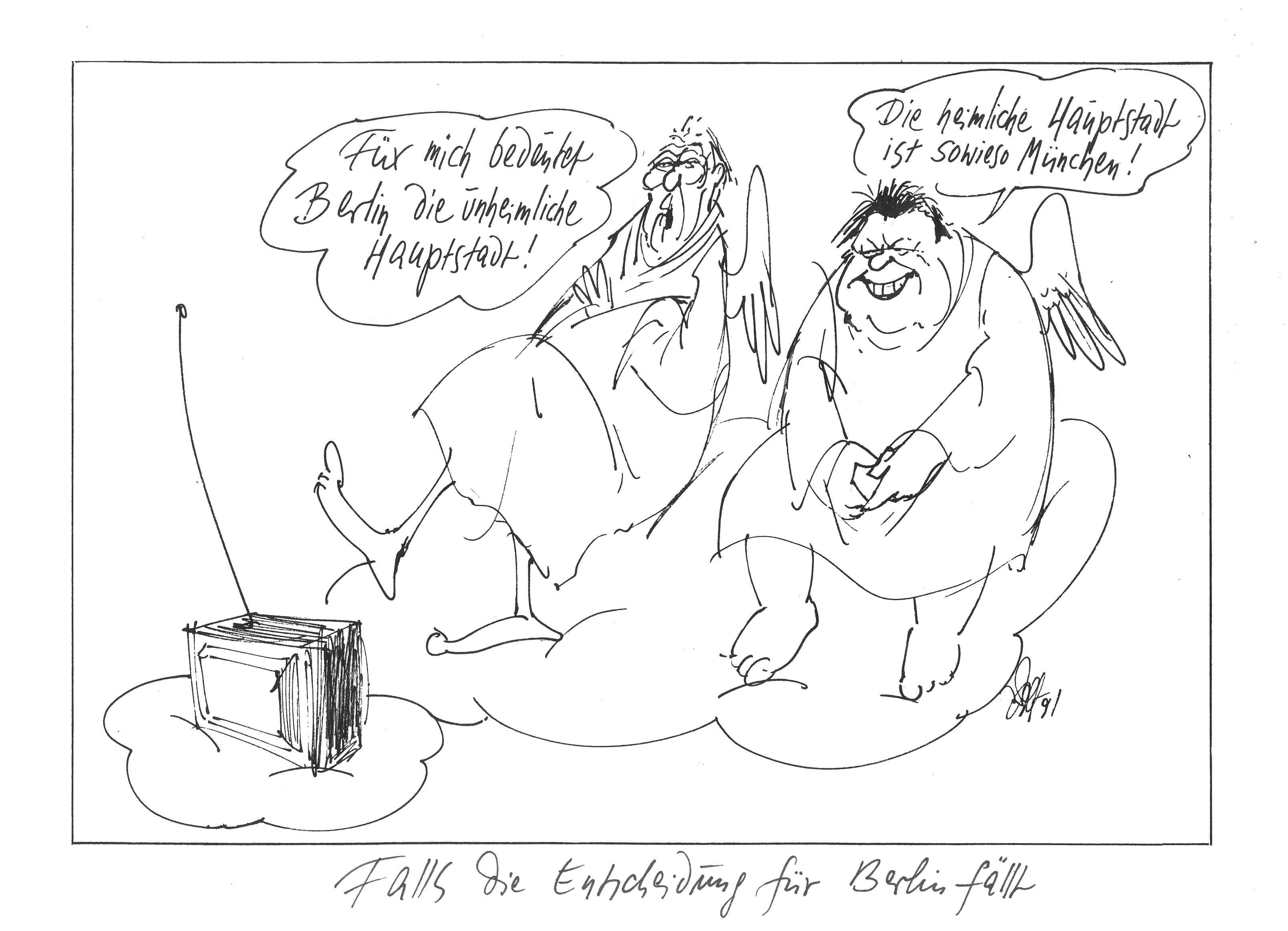 | Texte auf dem Bild | in Sprechblasen: Die heimliche Hauptstadt ist sowieso München!; Für mich bedeutet Berlin die unheimliche Hauptstadt! |