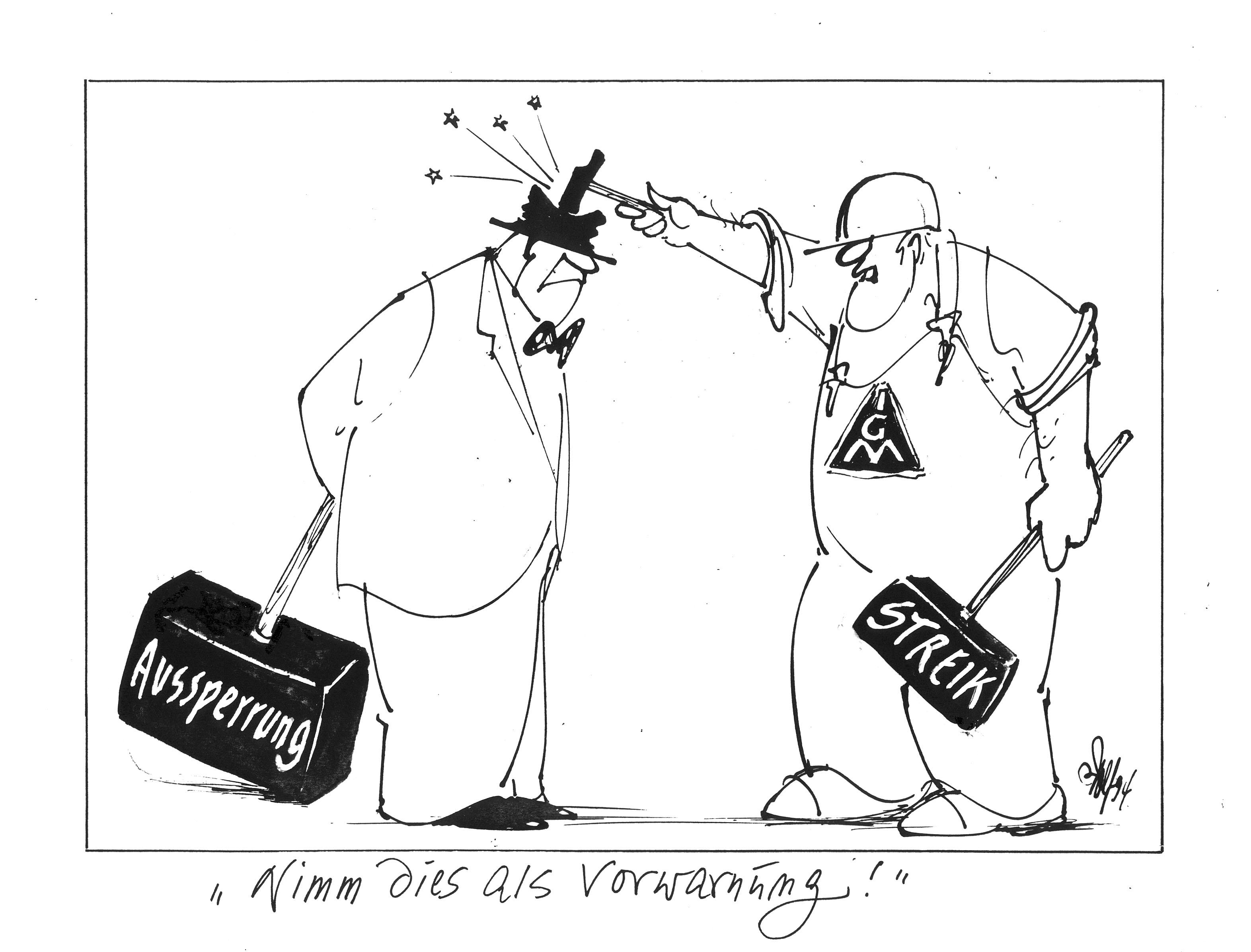 | Texte auf dem Bild | auf Hämmern: Aussperrung; STREIK; auf Blaumann: IGM |