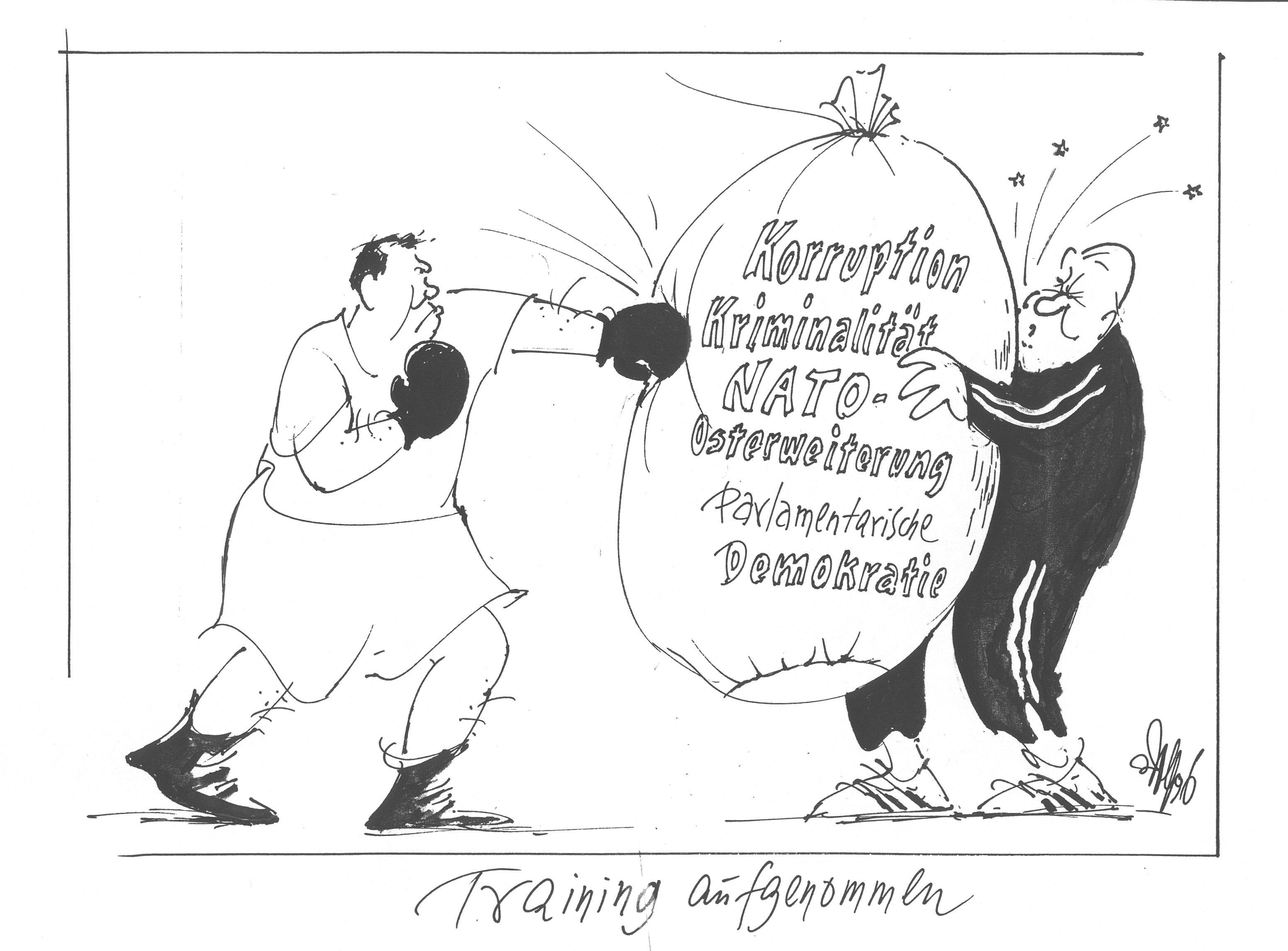 | Texte auf dem Bild | auf Sack: Korruption; Kriminalität; NATO-Osterweiterung; Parlamentarische Demokratie |