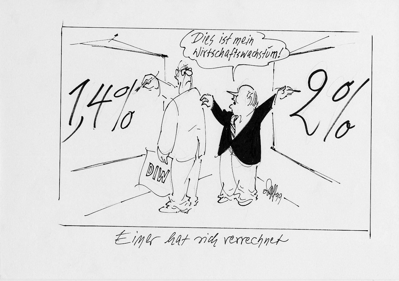 | Texte auf dem Bild | auf Papier: DIW; auf Tafeln: 1,4%; 2%; in Sprechblase: Dies ist mein Wirtschaftswachstum! |
