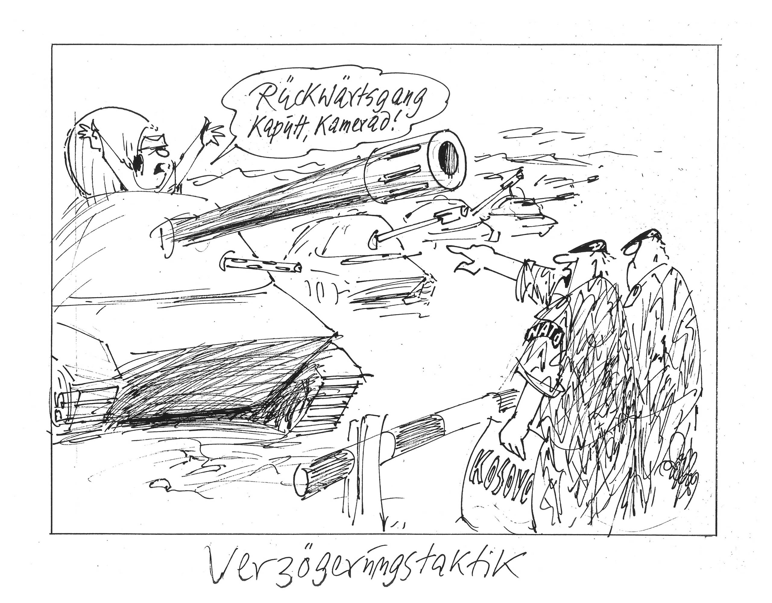 Texte auf dem Bild | in Spechblase: Rückwärtsgang kaputt, Kamarad!; auf Schild: KOSOVO; auf Armbinde: NATO |