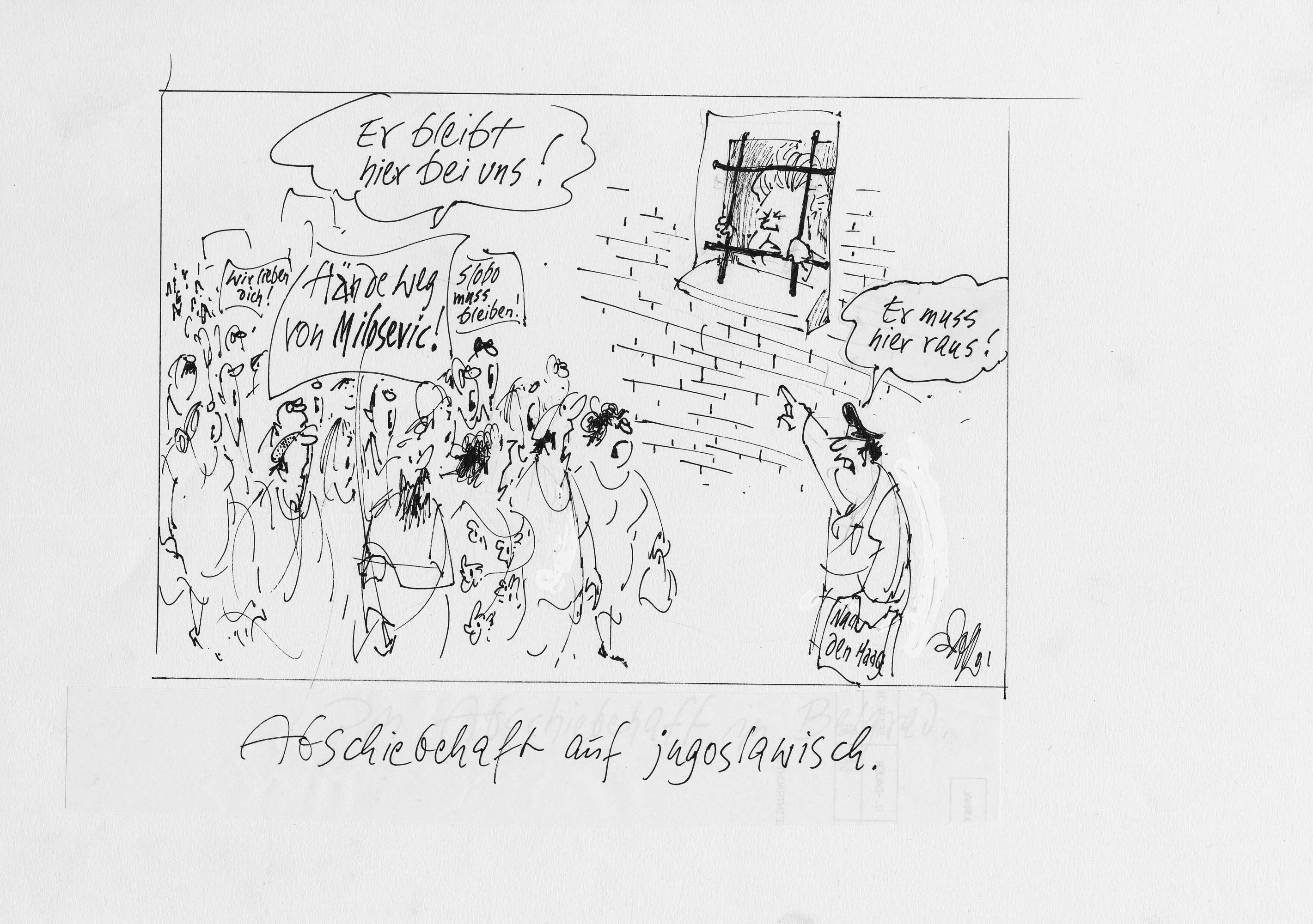 | Texte auf dem Bild | in Sprechblasen: Er bleibt hier bei uns!; Er muss hier raus!; auf Plakaten: Wir lieben dich!; Hände weg von Milosevic!; Slobo muss bleiben!; auf Blatt: Nach den Haag |